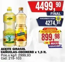 | ACEITE COCINERO GIRASOL x 1,5 lt | Maxiconsumo | $ 3.149,90 | 07 abril 2025 | 13 abril 2025 | |||