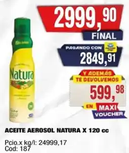 | Natura aceite aero 120 cc | Maxiconsumo | $ 2.899,90 | 11 agosto 2025 | 17 agosto 2025 | |||