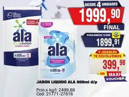 Durante estos días hay varias promociones activas para Ala jabón, tanto en Maxiconsumo como en otras cadenas importantes. Encontrás descuentos como 1+1 gratis, hasta 25% DTO o precios especiales en productos como Ala p.diluir jabon liquido ropa, Ala jabon liq matic ecolavado d/p y Ala jabon liq matic p/diluir d/p. Usá los filtros para elegir por tipo de presentación, contenido o tu comercio preferido.