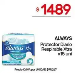 Diarco Always protectores diarios respirable anatómico ofertaAlways protectores diarios respirable anatómico 40 u.Diarco$ 3.499,0005 enero 202609 enero 2026