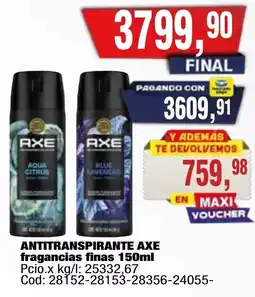 | Axe antitranspirante fragancias finas 150 ml | Maxiconsumo | $ 3.599,90 | 02 marzo 2026 | 08 marzo 2026 | |||