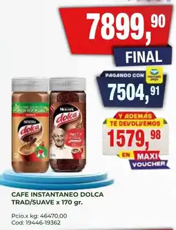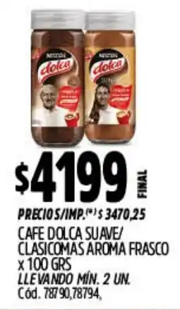 Durante estos días hay varias promociones activas para Café dolca suave, tanto en Maxiconsumo como en otras cadenas importantes. Encontrás descuentos como 1+1 gratis, hasta 25% DTO o precios especiales en productos como Nestlé cafe instantaneo dolca trad/suave, Dolca café suave/ clasicomas aroma frasco y Hisense smart tv 70". Usá los filtros para elegir por tipo de presentación, contenido o tu comercio preferido.