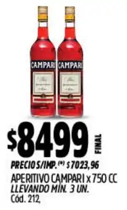 Supermercados Todo Campari aperitivo bitter ofertaCampari aperitivo bitter 750 ml.Supermercados Todo$ 12.800,00$ 10.000,00$ 2.800,00 Descuento23 febrero 202609 marzo 2026