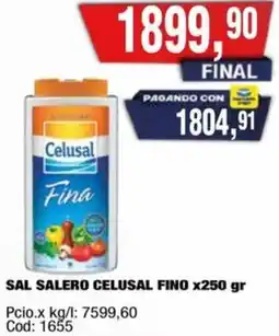 Supermercados DIA Celusal sal fina ofertaCelusal sal fina 500 g.Supermercados DIA$ 1.460,00$ 1.095,00$ 365,00 Descuento01 febrero 202628 febrero 2026