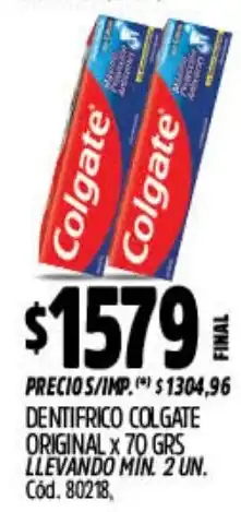 | DENTIFRICO COLGATE ORIGINAL X 70GRS | Supermercados Yaguar | $ 979,00 | 08 enero 2024 | 13 enero 2024 | |||