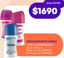 | 2 | Hinds desodorante variedades 60 g | Supermercados Tadicor | $ 2.250,00 | $ 1.690,00 | $ 560,00 Descuento | 11 febrero 2026 | 18 febrero 2026 | Ver oferta | |