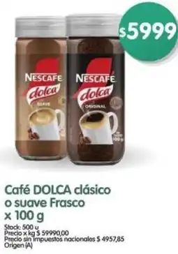 Durante estos días hay varias promociones activas para Dolca café, tanto en Supermayorista Vital como en otras cadenas importantes. Encontrás descuentos como 1+1 gratis, hasta 25% DTO o precios especiales en productos como Dolca cafe instantáneo frasco, Nestcafé dolca café clásico o suave frasco y Cafe dolca suave/ clasicomas aroma frasco. Usá los filtros para elegir por tipo de presentación, contenido o tu comercio preferido.