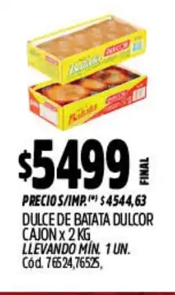 | Dulcor dulce de batata con choc./vain. caja 2 kg | Nini Mayorista | $ 4.899,00 | 01 septiembre 2025 | 07 septiembre 2025 |