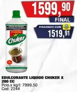 Carrefour Chuker edulcorante líquido clásico ofertaChuker edulcorante líquido clásico 400 ccCarrefour$ 4.619,00$ 3.465,00$ 1.154,00 Descuento10 febrero 202617 febrero 2026