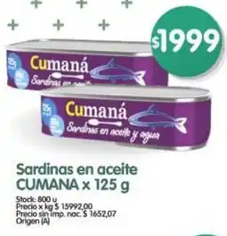 1Supermercados Buenos Días Cumana sardinas en aceite ofertaCumana sardinas en aceite 125 g Supermercados Buenos Días$ 1.999,0002 enero 202607 enero 2026 Ver oferta