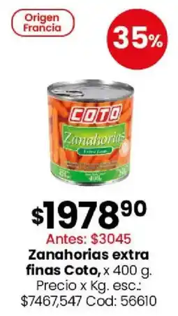 | Coto zanahorias extra finas 400 g | Coto | $ 3.045,00 | $ 1.978,90 | $ 1.066,10 Descuento | 27 abril 2026 | 04 mayo 2026 | |