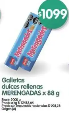 2Supermercados Buenos Días Merengadas galletas dulces rellenas ofertaMerengadas galletas dulces rellenas 88 gSupermercados Buenos Días$ 1.099,0029 enero 202604 febrero 2026 Ver oferta