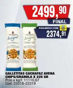 Durante estos días hay varias promociones activas para Galletitas cachafaz, tanto en Supermayorista Vital como en otras cadenas importantes. Encontrás descuentos como 1+1 gratis, hasta 25% DTO o precios especiales en productos como Cachafaz galletitas integral chips, Cachafaz avena galletitas chips/granola y Cachafaz galletitas org cacao/miel. Usá los filtros para elegir por tipo de presentación, contenido o tu comercio preferido.