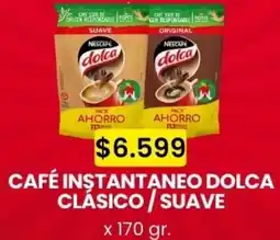Supermercados Buenos Días Dolca café instantáneo clásico o suave frasco ofertaDolca café instantáneo clásico o suave frasco 170 gSupermercados Buenos Días$ 7.499,0008 enero 202614 enero 2026