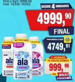 Durante estos días hay varias promociones activas para Jabon líquido para ropa, tanto en Maxiconsumo como en otras cadenas importantes. Encontrás descuentos como 1+1 gratis, hasta 25% DTO o precios especiales en productos como Jabon liquido ropa ala p.diluir, Cañuelas aceite girasoADEMAS TE DEVOLVEMOS y Cuarto trasero de pollo fresco. Usá los filtros para elegir por tipo de presentación, contenido o tu comercio preferido.