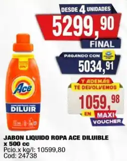 | 1 | Ace jabon liquido ropa diluible 500 cc | Maxiconsumo | $ 5.299,90 | 16 febrero 2026 | 22 febrero 2026 | Ver oferta | |||