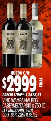 2Supermercados Yaguar Wampa vino malbec/ cabernet/tardio ofertaWampa vino malbec/ cabernet/tardio 750 cc.Supermercados Yaguar$ 2.999,0022 diciembre 202528 diciembre 2025 Ver oferta