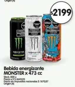 | Monster energiz 473 cc | Maxiconsumo | $ 2.399,90 | 24 noviembre 2025 | 07 diciembre 2025 | |||