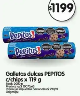 Supermercados Buenos Días Pepitos galletas dulces c/chips ofertaPepitos galletas dulces c/chips 119 g Supermercados Buenos Días$ 1.199,0027 noviembre 202503 diciembre 2025