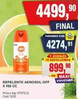 En esta página podés comparar los precios actuales de Repelente off aerosol en distintos comercios, como Maxiconsumo. Ya sea que estés buscando Off repelente aerosol, Off repelente family aerosol o Off repelente aerosol ext.dur, vas a ver de inmediato dónde se consigue al mejor precio. La oferta más económica aparece primero, con el nombre del comercio, el precio y el período de validez.