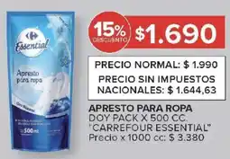 | Carrefour essential apresto para ropa doy pack 500 cc | Carrefour | $ 1.090,00 | 09 abril 2025 | 15 abril 2025 | |||
