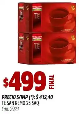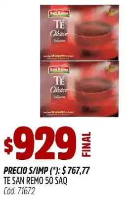 | San Remo Te 50saq. | Supermercados Yaguar | $ 55,49 | 25 mayo 2021 | 29 mayo 2021 | |||