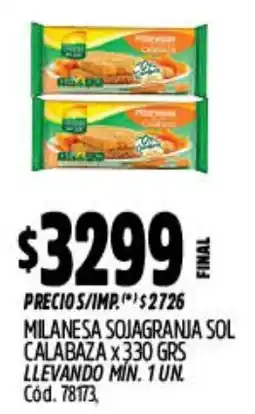 | Sojagranja del sol milanesa de espinaca 330 g | Supermercados Yaguar | $ 2.889,00 | 08 septiembre 2025 | 14 septiembre 2025 | |||