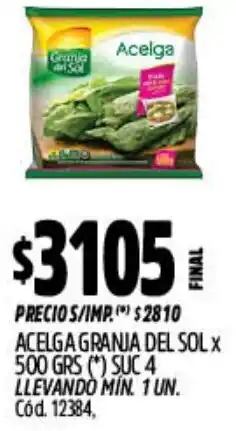 | Acelga granja del sol 500 g. | Supermercados Yaguar | $ 3.105,00 | 15 diciembre 2025 | 21 diciembre 2025 | |||