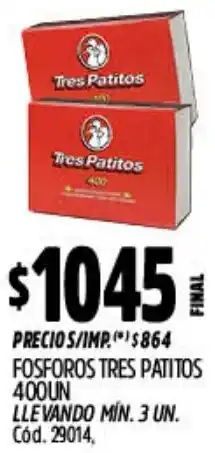 Durante estos días hay varias promociones activas para Tres, tanto en Supermercados Yaguar como en otras cadenas importantes. Encontrás descuentos como 1+1 gratis, hasta 25% DTO o precios especiales en productos como Tres patitos fosforos, Tres torres amargo y Granja tres arroyos prefritos rebozados. Usá los filtros para elegir por tipo de presentación, contenido o tu comercio preferido.