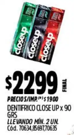 Supermercados Buenos Días Close up crema dental menta ofertaClose up crema dental menta 70 gSupermercados Buenos Días$ 1.699,0029 enero 202604 febrero 2026