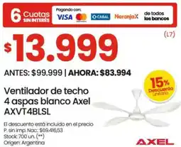 | Axel turbo ventilador 20p blanco eco | Changomas | $ 99.499,00 | $ 59.994,00 | $ 39.505,00 Descuento | 18 diciembre 2025 | 23 diciembre 2025 | |