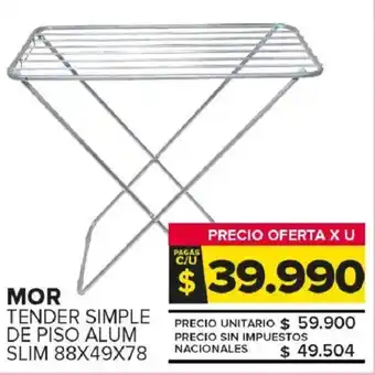 Esta oferta está disponible en varias tiendas y podés ver todos los productos para revisar dónde Mor tender simple de piso alum slim está a menor precio. Si querés averiguar si este producto tiene un descuento mayor en alguna otra tienda, mirá la categoría 'Supermercados'. Estas otras ofertas también podrían llamarte la atención: Fiorentina secador de piso, Conservadoras mor y Pileta mor.