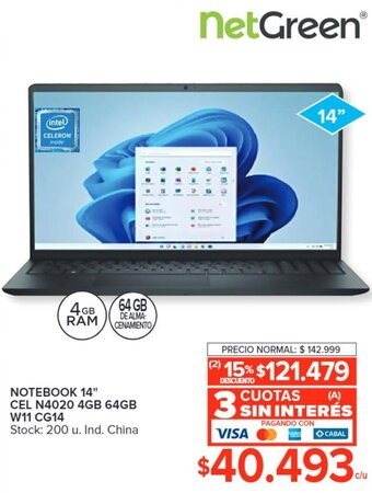 | NOTEBOOK 14" CEL N4020 4GB 64GB W11 CG14 | Carrefour | $ 142.999,00 | $ 40.493,00 | $ 102.506,00 Descuento | 30 agosto 2023 | 04 septiembre 2023 | |