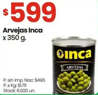 Esta oferta está disponible en varias tiendas y podés ver todos los productos para revisar dónde Inca arvejas está a menor precio. Si querés averiguar si este producto tiene un descuento mayor en alguna otra tienda, mirá la categoría 'Supermercados'. Estas otras ofertas también podrían llamarte la atención: Procenex limpiador líquido, La serenísima leches larga vida en botella y Oreo galletitas tripack.