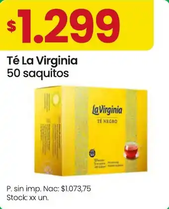 Esta oferta está disponible en varias tiendas y podés ver todos los productos para revisar dónde La Virginia té está a menor precio. Si querés averiguar si este producto tiene un descuento mayor en alguna otra tienda, mirá la categoría 'Supermercados'. Estas otras ofertas también podrían llamarte la atención: La virginia té, La virginia café y L.morenita-la virginia cafe molido.