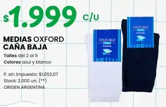 Medias oxford caña baja está en oferta en Changomas, válida desde 30-01-2026 hasta 23-02-2026. Consultá las promociones más recientes de Changomas para descubrir más descuentos especiales. Pedí Medias oxford caña baja online a través de la página web de Changomas o encontralo al mejor precio disponible. En Catalogosofertas.com.ar siempre vas a encontrar las mejores promociones de Medias oxford caña baja.
