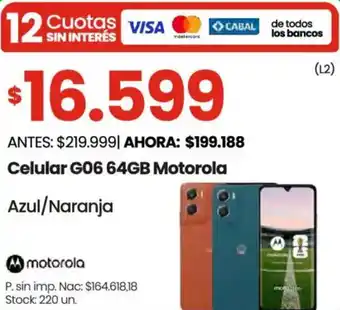Podés encontrar el precio de Motorola celular G06 en la parte superior de la página, donde también están las fechas en las que la oferta estará disponible. También podés mirar el precio en el Catálogo Changomas actualizado o en el sitio web de Changomas. Las ofertas y promociones son la mejor forma de asegurarte de que estás comprando los productos de Changomas al precio más bajo del mercado.