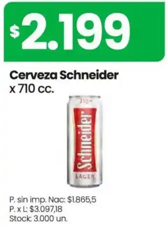 Esta oferta está disponible en varias tiendas y podés ver todos los productos para revisar dónde Schneider cerveza está a menor precio. Si querés averiguar si este producto tiene un descuento mayor en alguna otra tienda, mirá la categoría 'Supermercados'. Estas otras ofertas también podrían llamarte la atención: Schneider cerveza lata, Schneider cerveza lata y Quilmes cerveza.