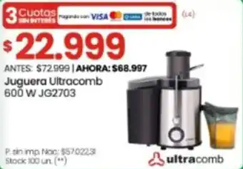 Esta oferta está disponible en varias tiendas y podés ver todos los productos para revisar dónde Ultracomb juguera está a menor precio. Si querés averiguar si este producto tiene un descuento mayor en alguna otra tienda, mirá la categoría 'Supermercados'. Estas otras ofertas también podrían llamarte la atención: Ultracomb freidora de aire, oferta 2 y oferta 3.
