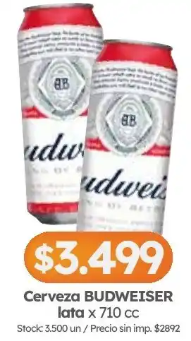 Esta oferta está disponible en varias tiendas y podés ver todos los productos para revisar dónde Budweiser cerveza lata está a menor precio. Si querés averiguar si este producto tiene un descuento mayor en alguna otra tienda, mirá la categoría 'Supermercados'. Estas otras ofertas también podrían llamarte la atención: Budweiser cerveza blanca botella, Quilmes cerveza lata y Heineken cerveza lata.