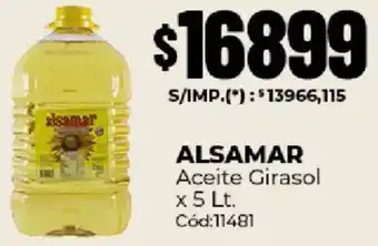 Esta oferta está disponible en varias tiendas y podés ver todos los productos para revisar dónde Alsamar aceite girasol está a menor precio. Si querés averiguar si este producto tiene un descuento mayor en alguna otra tienda, mirá la categoría 'Mayorista'. Estas otras ofertas también podrían llamarte la atención: Legitimo aceite girasol, Cocinero aceite girasol y Natura aceite girasol.