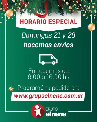Los horarios de apertura actuales de El Nene en La Plata los puedes encontrar fácilmente seleccionando tu sucursal. Ve a 'sucursales' y haz clic en la ubicación para encontrar los horarios de apertura de tu tienda El Nene. Durante las festividades, como Navidad, los horarios de El Nene pueden variar. Consulta los horarios más actualizados en la parte superior de esta página o visita el sitio web de El Nene para obtener los horarios de apertura actuales durante: