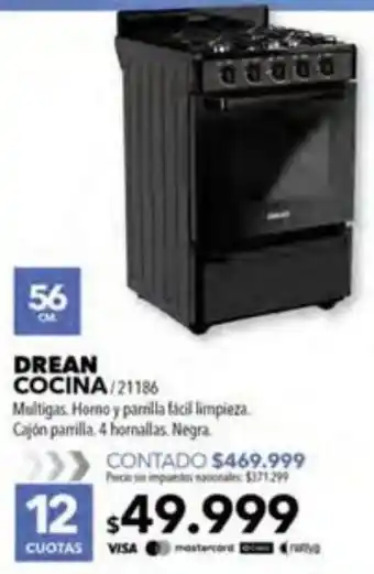 Esta oferta está disponible en varias tiendas y podés ver todos los productos para revisar dónde Drean cocina está a menor precio. Si querés averiguar si este producto tiene un descuento mayor en alguna otra tienda, mirá la categoría 'Electrónica'. Estas otras ofertas también podrían llamarte la atención: Drean cocina, Drean cocina CD5603ABO y Drean cocina multigas. horno y parrilla fácil limpieza..