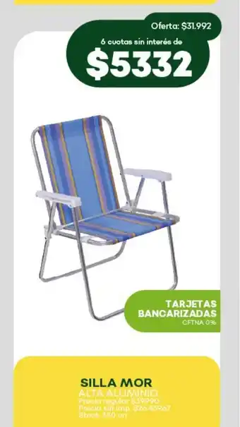 Esta oferta está disponible en varias tiendas y podés ver todos los productos para revisar dónde SILLA MOR está a menor precio. Si querés averiguar si este producto tiene un descuento mayor en alguna otra tienda, mirá la categoría 'Supermercados'. Estas otras ofertas también podrían llamarte la atención: Silla mor alta aluminio, Reposera mor sannet y Reposera mor 8 posiciones.