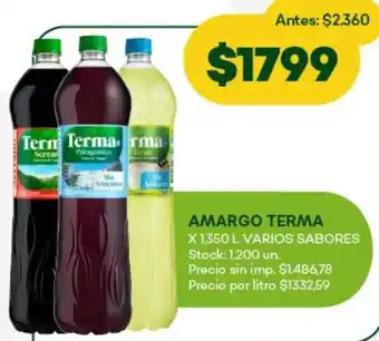 Esta oferta está disponible en varias tiendas y podés ver todos los productos para revisar dónde Terma amargo varios sabores está a menor precio. Si querés averiguar si este producto tiene un descuento mayor en alguna otra tienda, mirá la categoría 'Supermercados'. Estas otras ofertas también podrían llamarte la atención: Terma amargo varios sabores, Terma amargo y Terma amargo clásicos o cero.