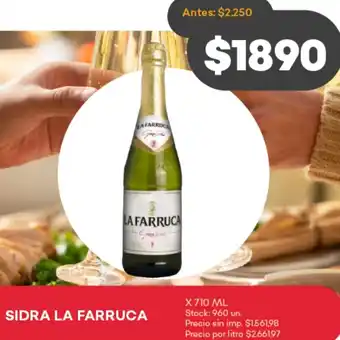 Esta oferta está disponible en varias tiendas y podés ver todos los productos para revisar dónde Sidra la farruca está a menor precio. Si querés averiguar si este producto tiene un descuento mayor en alguna otra tienda, mirá la categoría 'Supermercados'. Estas otras ofertas también podrían llamarte la atención: La farruca sidra, La farruca sidra sin alcohol y La farruca ananá fizz.