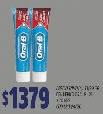 Esta oferta está disponible en varias tiendas y podés ver todos los productos para revisar dónde Oral B dentifrico está a menor precio. Si querés averiguar si este producto tiene un descuento mayor en alguna otra tienda, mirá la categoría 'Mayorista'. Estas otras ofertas también podrían llamarte la atención: Oral B dentifrico extra blanco, Oral B dentifrico blancura con bicarbonato y Oral B dentifrico extra blanco.